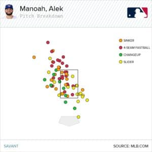 Manoah’s slider is nasty. It has 14.3 inches of break which is the 20th most break of any slider in baseball. That is a lot of horizontal movement which is why despite the sometimes poor location Manoah has only allowed a 26.1% hard hit rate and an exit velocity against of 84.9 mph on that pitch…