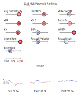 His K% is also in the 69th percentile… nice. Sorry, I’ve already made that joke, but his 30.6 K% is no joke. I’m leaving this joke in here, but after the Monday update, he’s now in the 83rd percentile for K%, so yeah, dude just gets strikeouts.