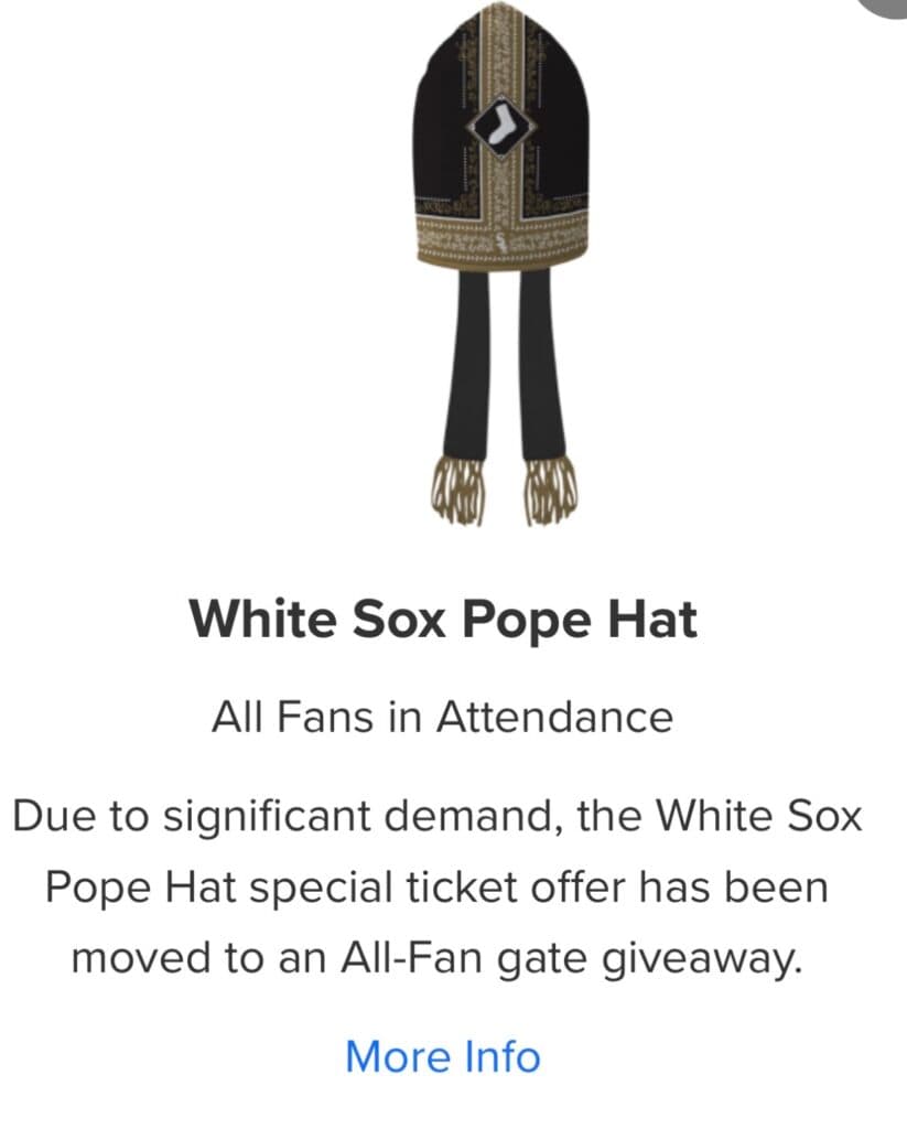 Again, this was only supposed to be a limited giveaway, but it has turned into an all-fan giveaway based on its explosive popularity. Brace yourself for the sea of popes in the stadium, and I certainly hope they make all White Sox fans wear the hat the entire game.