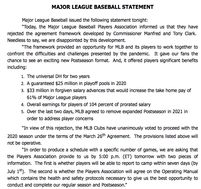 The PA didn’t vote in favour of MLB’s last offer, which featured a season that they deemed to be too short and pro-rated salaries. The big sticking point for the players, though, was voting in favour of that deal would have also resulted in them waiving their ability to file a grievance.
