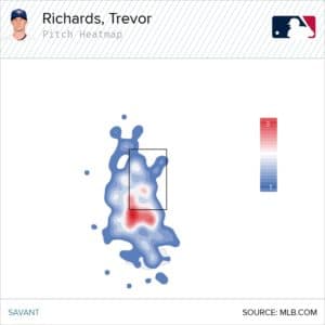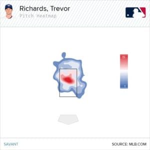 Richards has a 22.2% swinging strike rate per FanGraphs on the change-up which is expected given the location and movement. It’s his primary strikeout pitch that has helped strike out 11.65 batters per nine this season, a career-high. In today’s game if hitters aren’t swinging over that pitch they are getting under it and hitting it in the air and Richards is no exception. His groundball rate has dropped 10% down to 22.7%, while his flyball rate has climbed to a career-high 48.0%. What this has done is it’s kept his batting average on balls in play very low (since fly balls have a lower BABIP than grounders), but can lead to home runs.