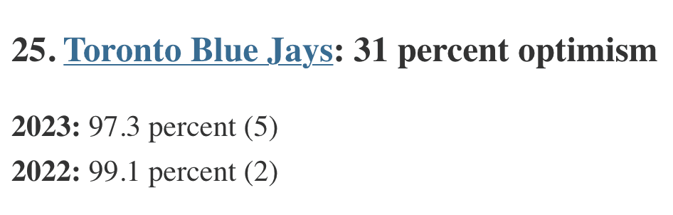 Compared to the 2022 and 2023 seasons, it is evident that the Blue Jays roster is in a puzzling place with more crowding in the infield and designated hitter spots while their pitching has taken a hit with a flurry of injury concerns from starting pitchers Kevin Gausman and Alek Manoah along with backend relievers Jordan Romano and Erik Swanson. While all these concerns weren’t reflected in The Athletic survey, it’s undeniable that Toronto’s fanbase became disillusioned with diminishing returns and constant underperformance over the past few years. This mounting negativity is the main reason why the Blue Jays only recorded a 31 percent optimism score for the 2024 season, which is a 66.3 percent decline compared to last season.