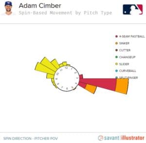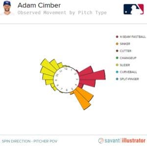 Cimber’s third pitch is his slider. He throws it 34.4% of the time, throwing it to both righties and lefties. The spin of his slider mirrors his sinker and his fastball, while the slider moves in the opposite direction of the sinker, giving Cimber three different pitches that move in three different directions.
