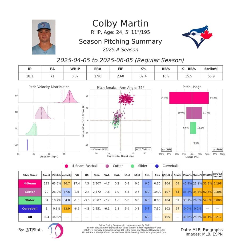 That said, pitching was still incredibly new to Martin; he’s only had a year of being a full-time reliever under his belt. The stuff was/is undeniable, he just had to get more reps in so he could improve the feel and gain more confidence and conviction in his stuff. With an offseason to continue to focus solely on pitching and refining his control/command, Martin worked closely with the Blue Jays at their Player Development Complex in Dunedin, where he was already pitching. He was hoping to come out of the gates much better in 2o25.