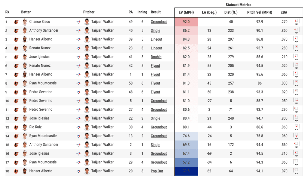 - It all started with Taijuan Walker, who made his Blue Jays debut after being acquired from the Seattle Mariners on Thursday. After missing the majority of the last two seasons due to injury, Walker has enjoyed a nice rebound so far in 2020, and, of course, the hope is that continues with Toronto as the team pushes for a playoff run. Walker came as advertised on Saturday, throwing the Orioles a fastball, sinker, cutter, splitter, and curveball combination. He worked with ease through six innings, allowing four hits and three walks while striking out four. The Orioles couldn’t manage to muster any hard contact off of Walker, as their hardest-hit ball off of him was a 92.0 mile-per-hour groundout off of the bat of Chance Sisco in the sixth inning.