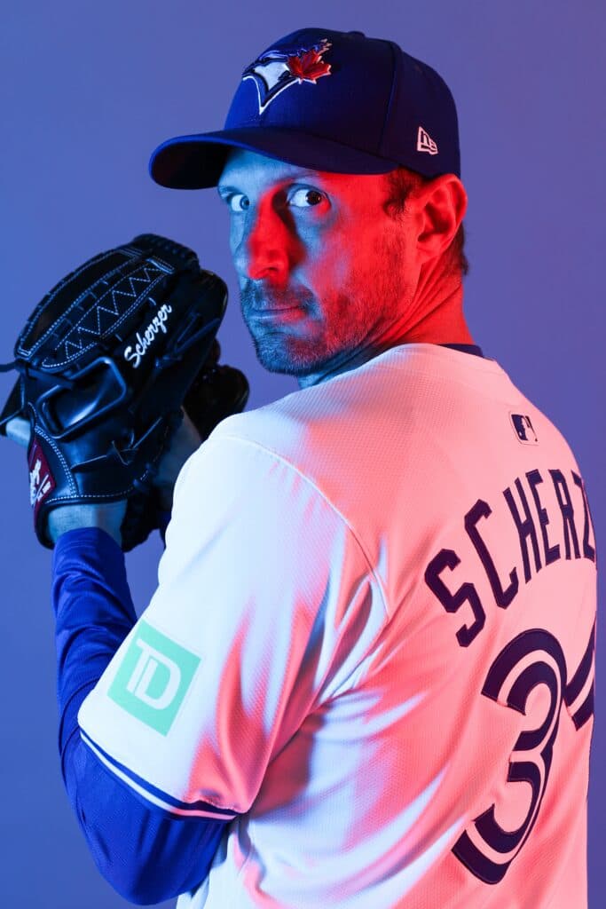 Feb 21, 2025; Dunedin, FL, USA; Toronto Blue Jays pitcher Max Scherzer (31) participates in media day at the Blue Jays Player Development Complex. Mandatory Credit: Nathan Ray Seebeck-Imagn Images