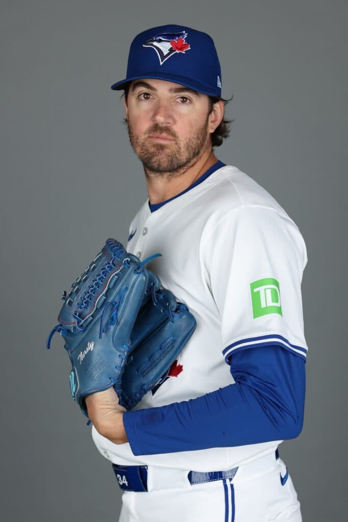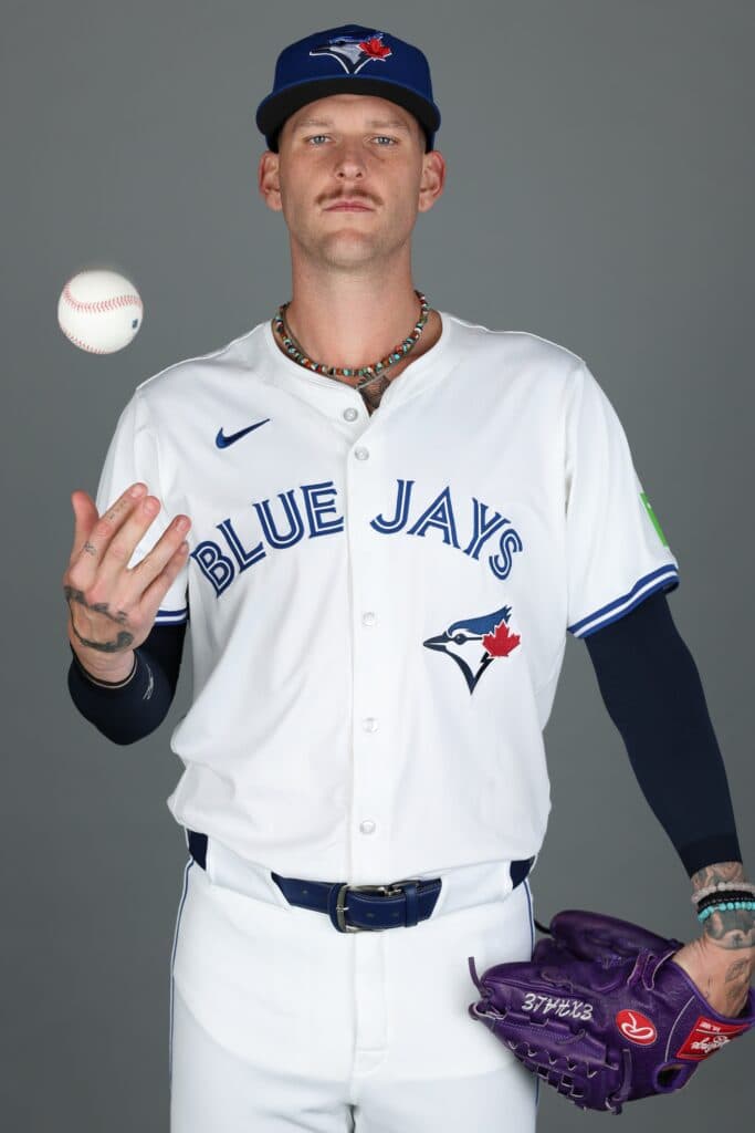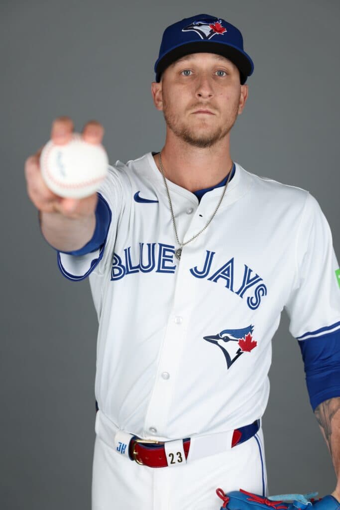 Feb 21, 2025; Dunedin, FL, USA; Toronto Blue Jays pitcher Jeff Hoffman (23) participates in media day at the Blue Jays Player Development Complex. Mandatory Credit: Nathan Ray Seebeck-Imagn Images