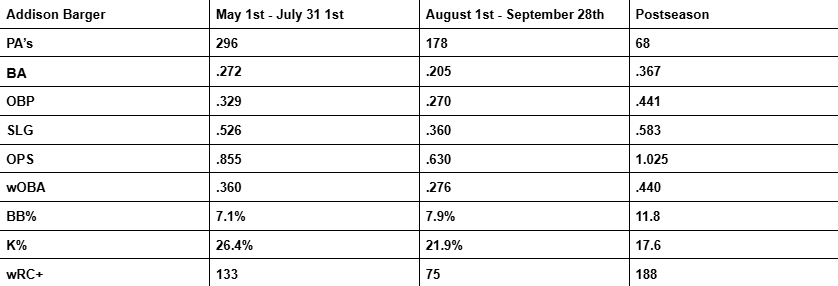 As most young hitters with Barger’s profile go through an adjustment period once pitchers start pitching them differently, once they experience initial success, and this was validated by Barger’s fantastic run during the postseason, albeit in the smallest of small sample sizes. One last piece of context to consider when factoring in Barger’s disastrous end to the season, his BABIP dropped .101 points (.330 – .229) from August 1st till the end of the year, from where it was up until July 31st.