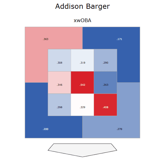As you would expect, Barger crushes mistakes. His .589 xwOBA on pitches in the heart of the zone is firmly amongst the elite. However, his affinity for mashing baseballs has made him susceptible to pitches on the edges, which teams exploited more against him in the second half. This feels like something more of a fad than a trend, though.