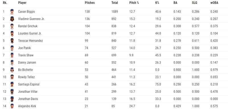 Here is the same chart we saw above but for the Blue Jays hitters instead of the Rays.