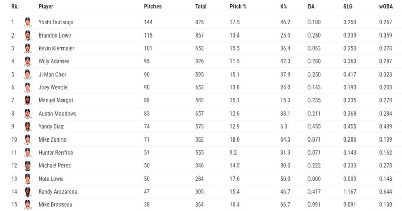 Here are the all the Rays hitters who saw at least 50 pitches at or above 95 mph this season, per Baseball Savant. Many of the Rays key hitters, Tsutsugo, Kiermaier, Adames, Wendle, Meadows, Renfroe, and Zunino, have really struggled against high velocity. That is a large portion of the line-up. Yandy Díaz is the one Rays hitter who succeeds against velocity, he’s currently hurt and it’s not yet known if he will be on the playoff roster. If he is, he needs to be fed a healthy diet of breaking balls and off-speed pitches.
