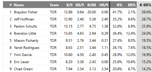 If you filter all Blue Jays relievers by a minimum of 10 innings pitched this season, you’ll find Fisher’s name at the top of multiple key categories, including: K% (41.7), BB% (2.1), K-BB% (39.6), and SIERA (1.11). However, the most impressive metric of them all may be that he’s second on the team in fWAR, and trails Brendon Little by just .2 despite pitching in 17 fewer innings.