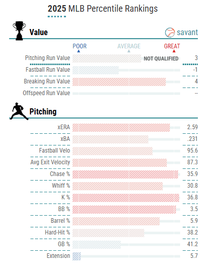 How has he done this, you may be wondering? With a devastating slider/curveball mix. Both pitches have returned a 30% whiff rate or better, both pitches have extremely low expected batting averages against (.212 for the slider and .231 for the curveball), and most importantly, hitters are making extremely soft contact against those two offerings (86 MPH average EV).