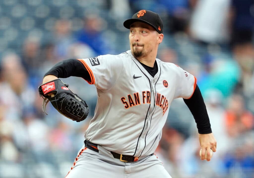 Sep 22, 2024; Kansas City, Missouri, USA; San Francisco Giants starting pitcher Blake Snell (7) pitches during the first inning against the Kansas City Royals at Kauffman Stadium. Mandatory Credit: Jay Biggerstaff-Imagn Images