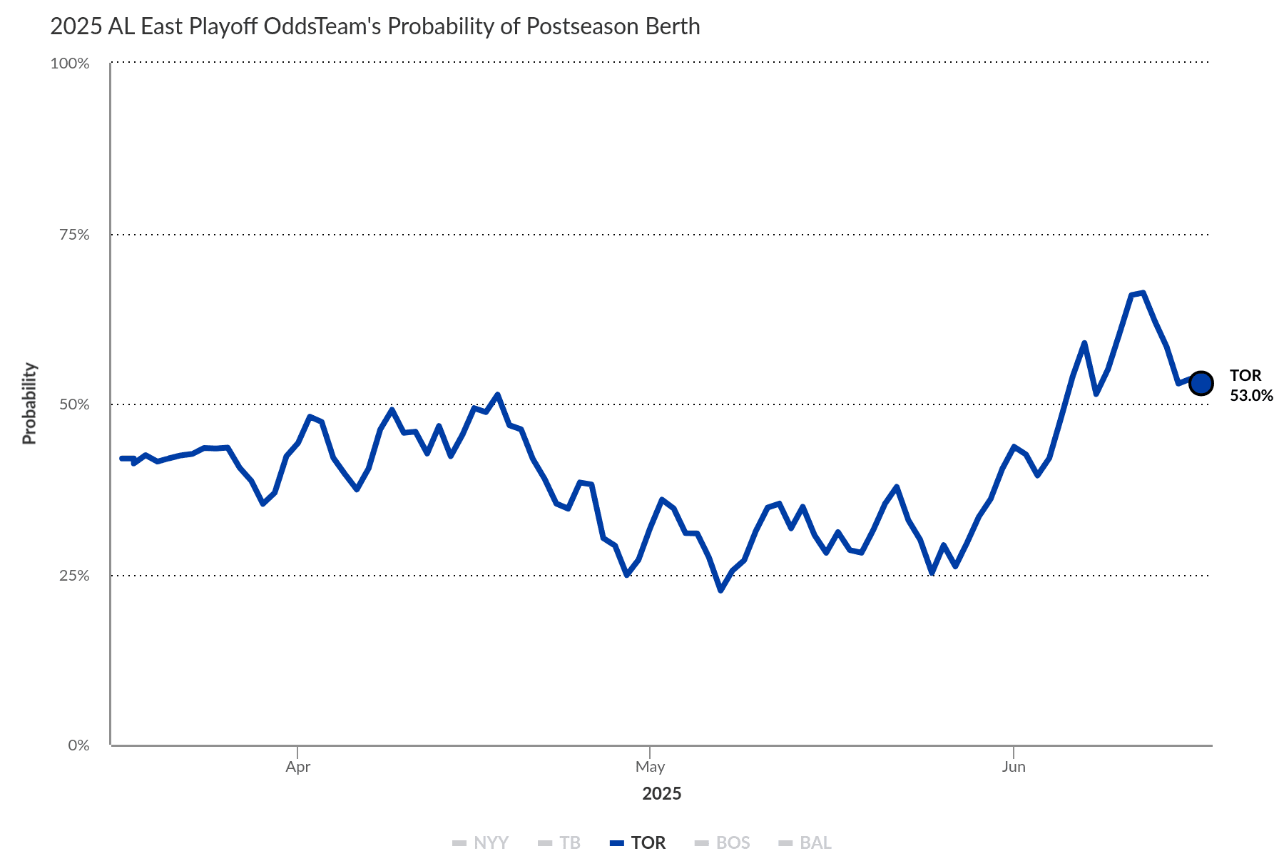 Let’s start with the Blue Jays here. Prior to being swept in Philadelphia, Toronto’s club had entered that series having won 12 of its previous 14 games and was one of the hottest teams in baseball. That impressive stretch boosted their playoff odds significantly, soaring from 26.2 per cent on May 27 to a season-high 66.3 per cent before Friday’s opener.
