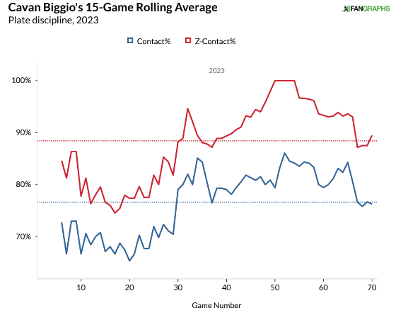 Thanks to that breakthrough, Biggio is hunting damage earlier in counts rather than letting hittable pitches fly past, and that’s boosted his run production while lowering his strikeout totals. It also has him walking a bit more versus the first two months of the schedule (7.8% to 8.8%).
