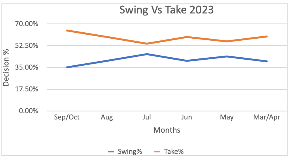 Here is a look at Biggio’s swing/take percentages for the year, starting with September and October on the left and working backward to April and March.