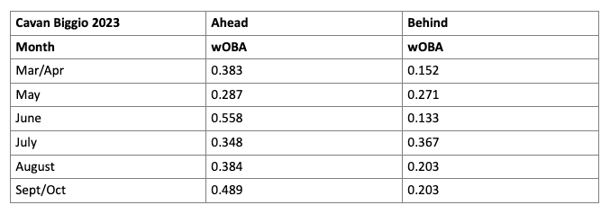 So, if April was such a bad month for Biggio, what was a common theme? For one, he was behind the count more than he was ahead. He had by far the lowest exit velocity of the year (79.6mph! per baseball savant), and his OPS was just over .400. Usually, being behind in the count is much more predictable to have a worse wOBA versus being ahead.