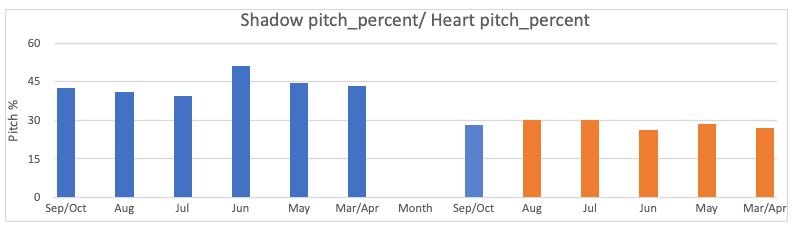 To understand the importance of the heart and shadow part of the zone check out this graph showing the number of pitches thrown to him in both parts. The Shadow zone is represented in Blue, whilst the heart is in orange.