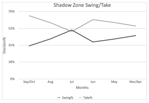 Now this is all in the lens of getting ahead of counts more often for an increase in wOBA. Swinging in the shadow zone is not good for wOBA. Therefore, tracking his swing/take in the shadow zone is important.
