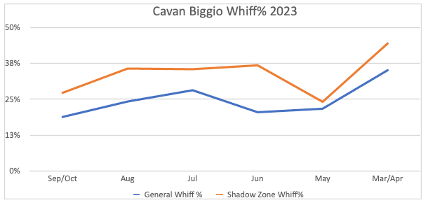While Cavan did well in his whiff percentage, in the shadow zone it was still much higher than his general whiff percentage for the month. However, with his low production within the heart of the zone, it’s difficult to gauge how sustainable this is in the long run. However, with more consistent playing time, Biggio was dealing. There’s no question of that.