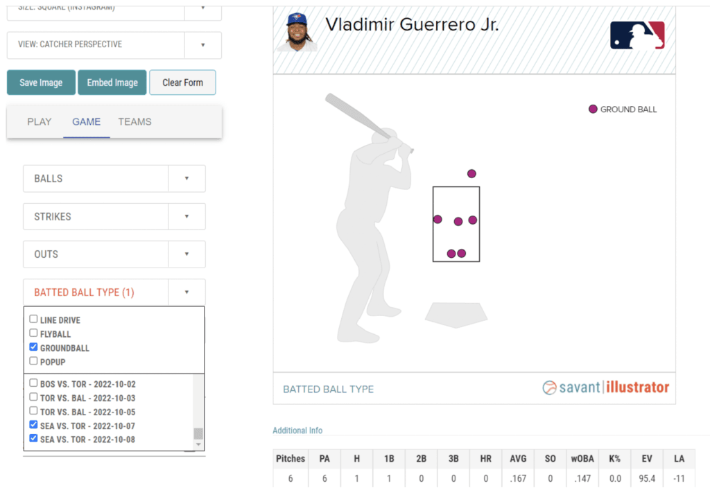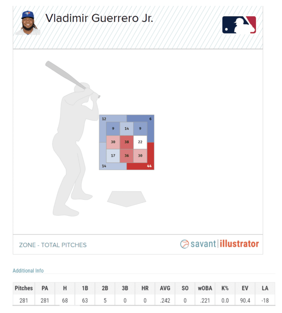 Below is a picture courtesy of Baseball Savant of the strike zone catcher’s perspective, where Vlad hit a ground ball the most…
