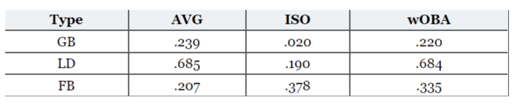 While every player has there kryptonite, our best hitter was absolutely exposed when it mattered most in the playoffs. Groundballs are the least productive way to generate offensive productivity, as you can see from this table created by Piper Slowinski of FanGraphs…