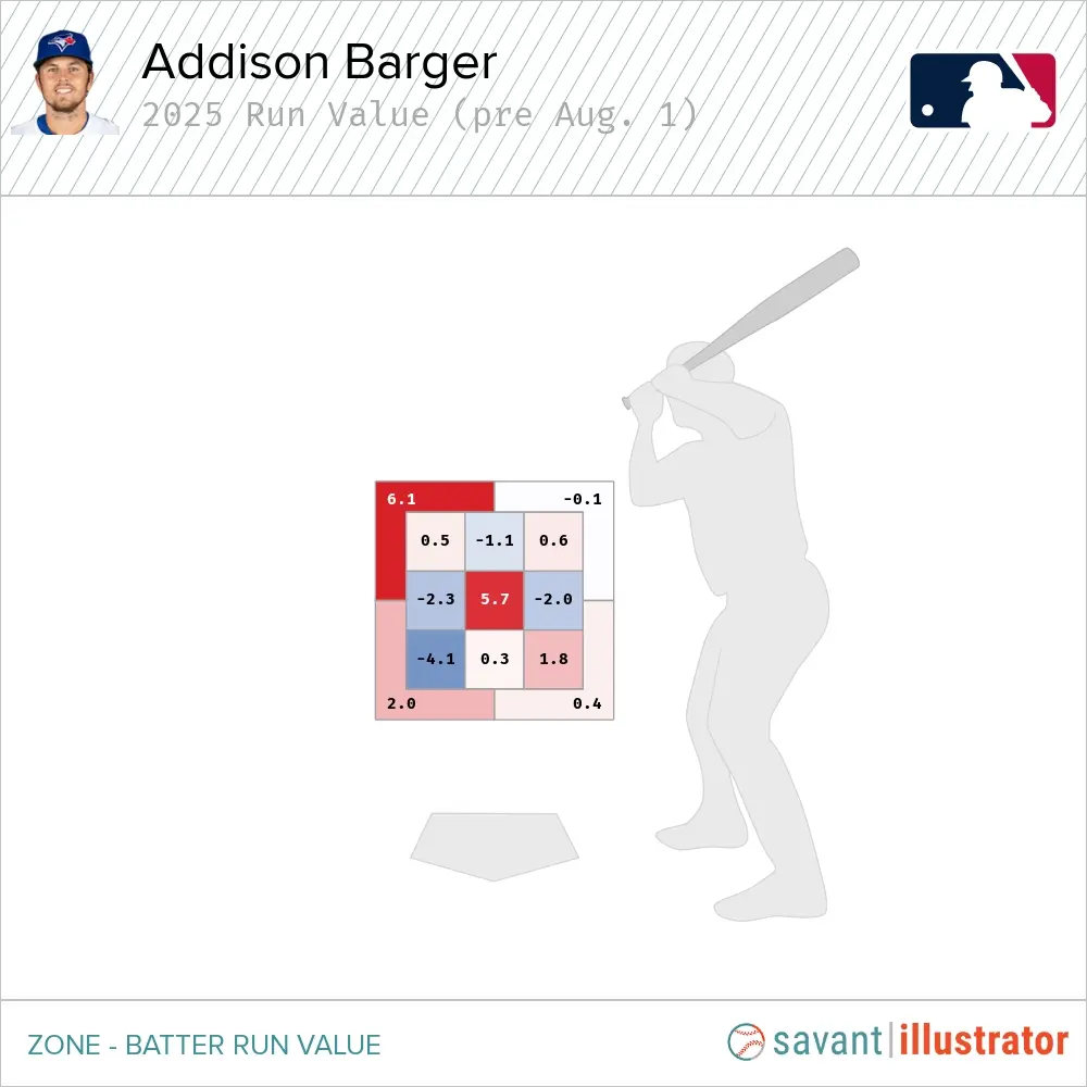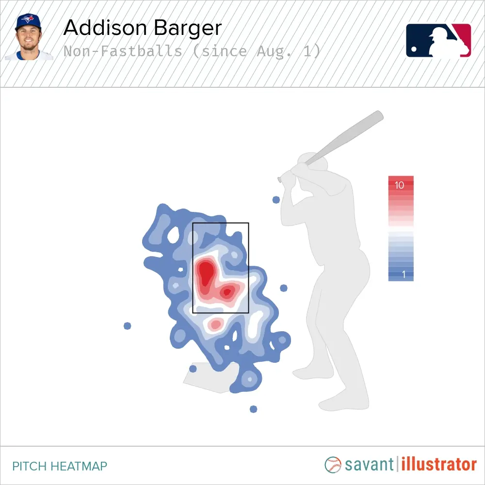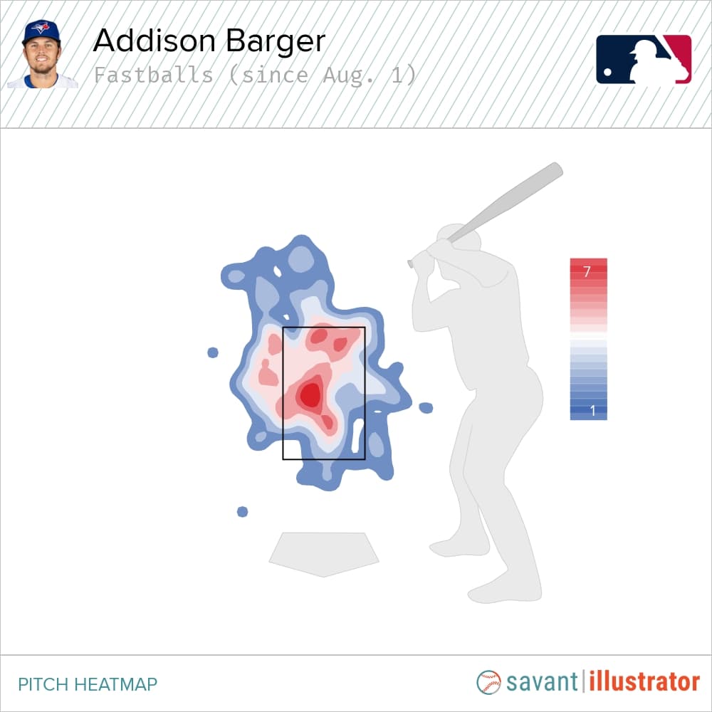 It’s far more difficult to square up pitches on the outer half than it is against ones on the inner half of the plate, especially with a pull-heavy approach like Barger’s. That’s why pitchers continue to expose this weakness in his game. It’s also why he’s gone from hitting .283/.325/.503 with a plus-three run value versus fastballs from May to July to featuring a .200/.294/.333 slash line and a minus-three run value this month.