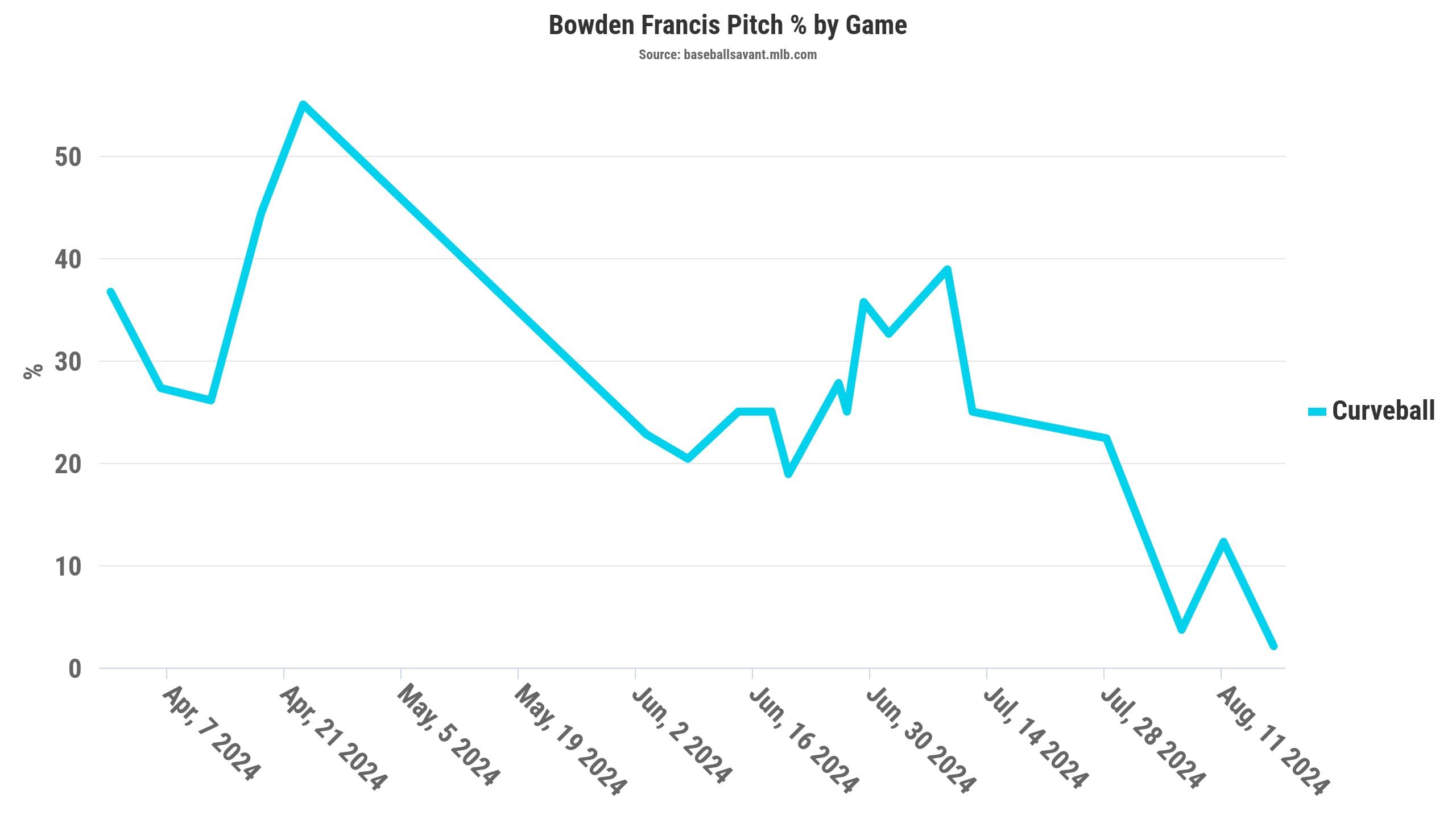 Because of this decline, Francis has gradually reduced his curveball usage over the last few months, phasing it out to the point that he has nearly abandoned it this month.