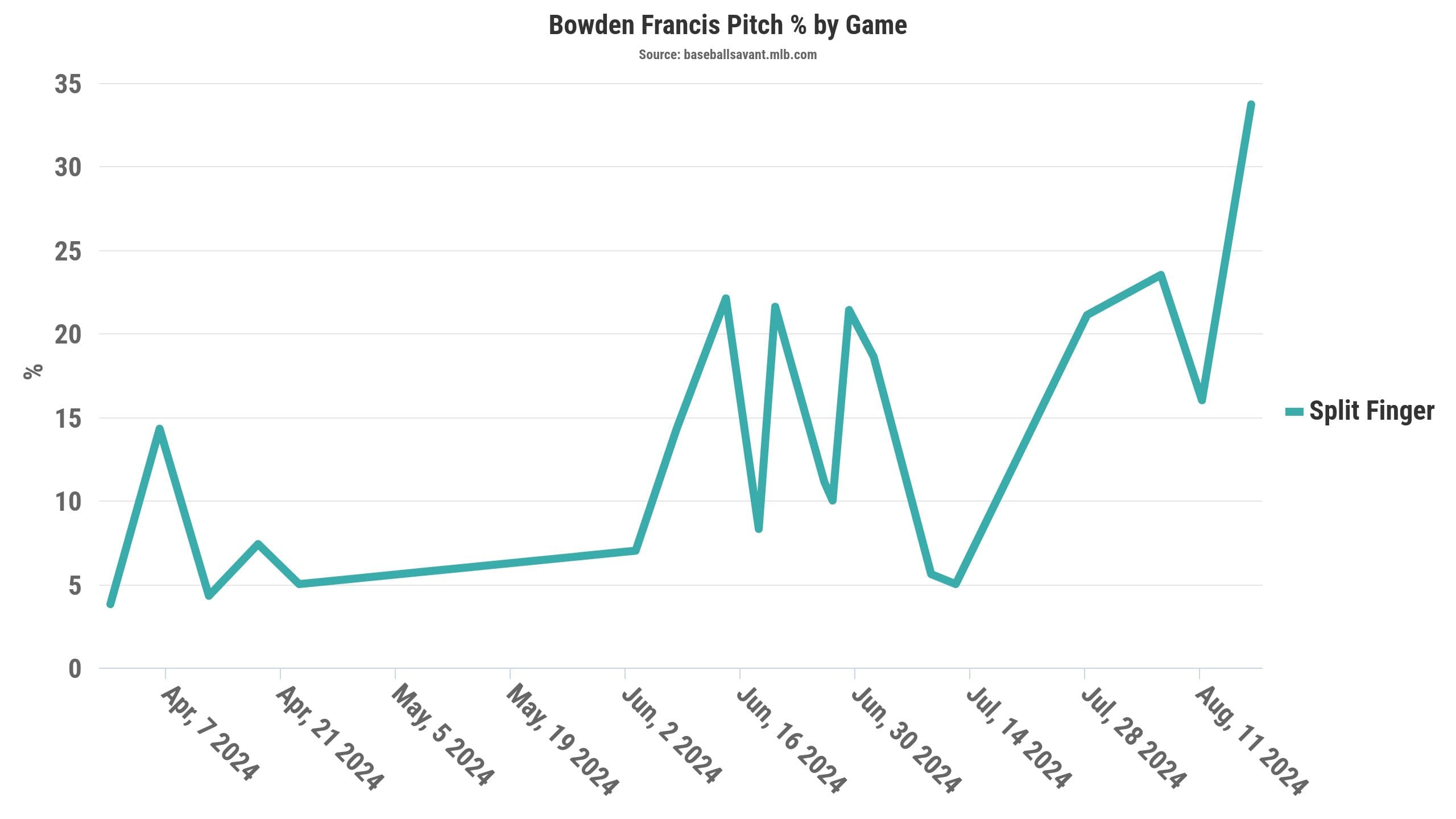 Of the three starts Francis has made in August, two have included outings where he’s thrown three or fewer curveballs as he’s shifted his focus to another secondary weapon — his splitter, which has seen its usage trend in the opposite direction of late.