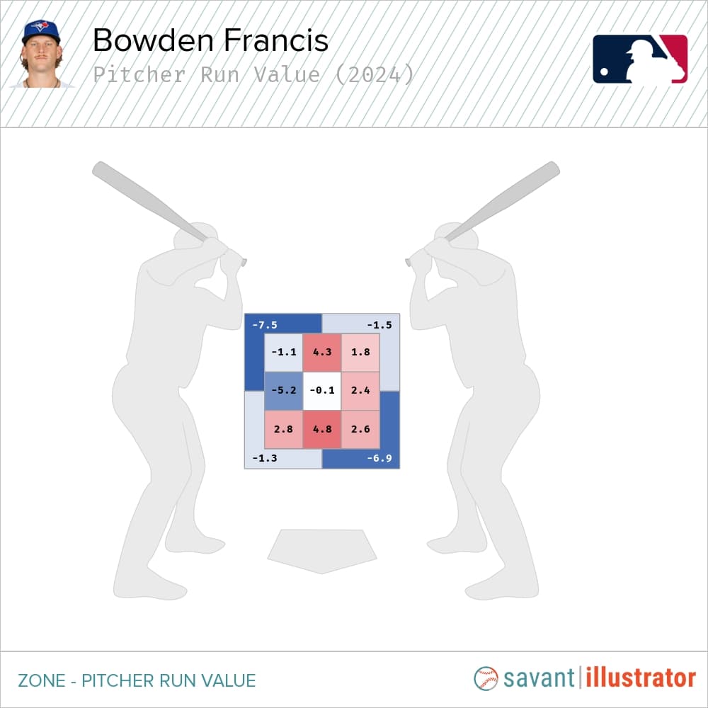 Francis’ fastball has produced similar results, earning a plus-five run value thus far. His curveball, on the other hand, hasn’t looked the same. It has allowed a ton of damage in 2024, with opposing hitters posting a .326 AVG and .628 SLG against it. Though it’s endured a fair bit of bad luck, given its 20-per-cent hard-hit rate against, it still carries a minus-eight run value — tied for second-worst in the majors among qualified curveballs (min. 25 plate appearances).