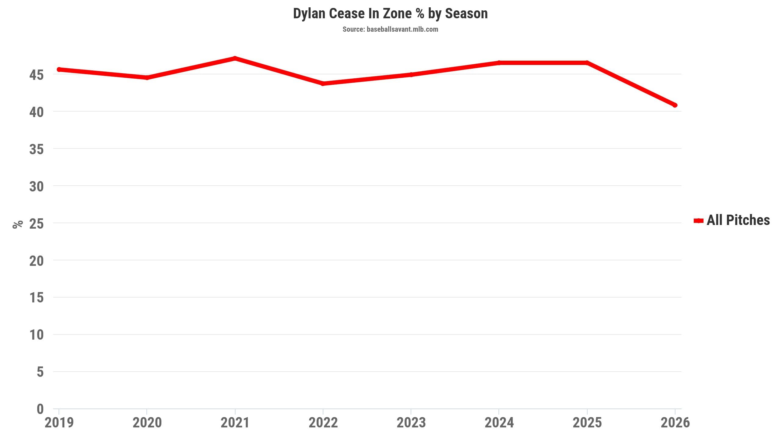 Cease owns the lowest first-pitch strike rate (52.3 per cent) of his career this season, nearly eight per cent lower than last season’s percentage. Of the five starts he’s made thus far, he’s yet to finish higher than 59 per cent in any of those outings and has already produced his second-lowest clip (43.5 per cent) from the last three seasons, ahead of only his miserable 42.1 per cent rate on Aug. 16, 2025.