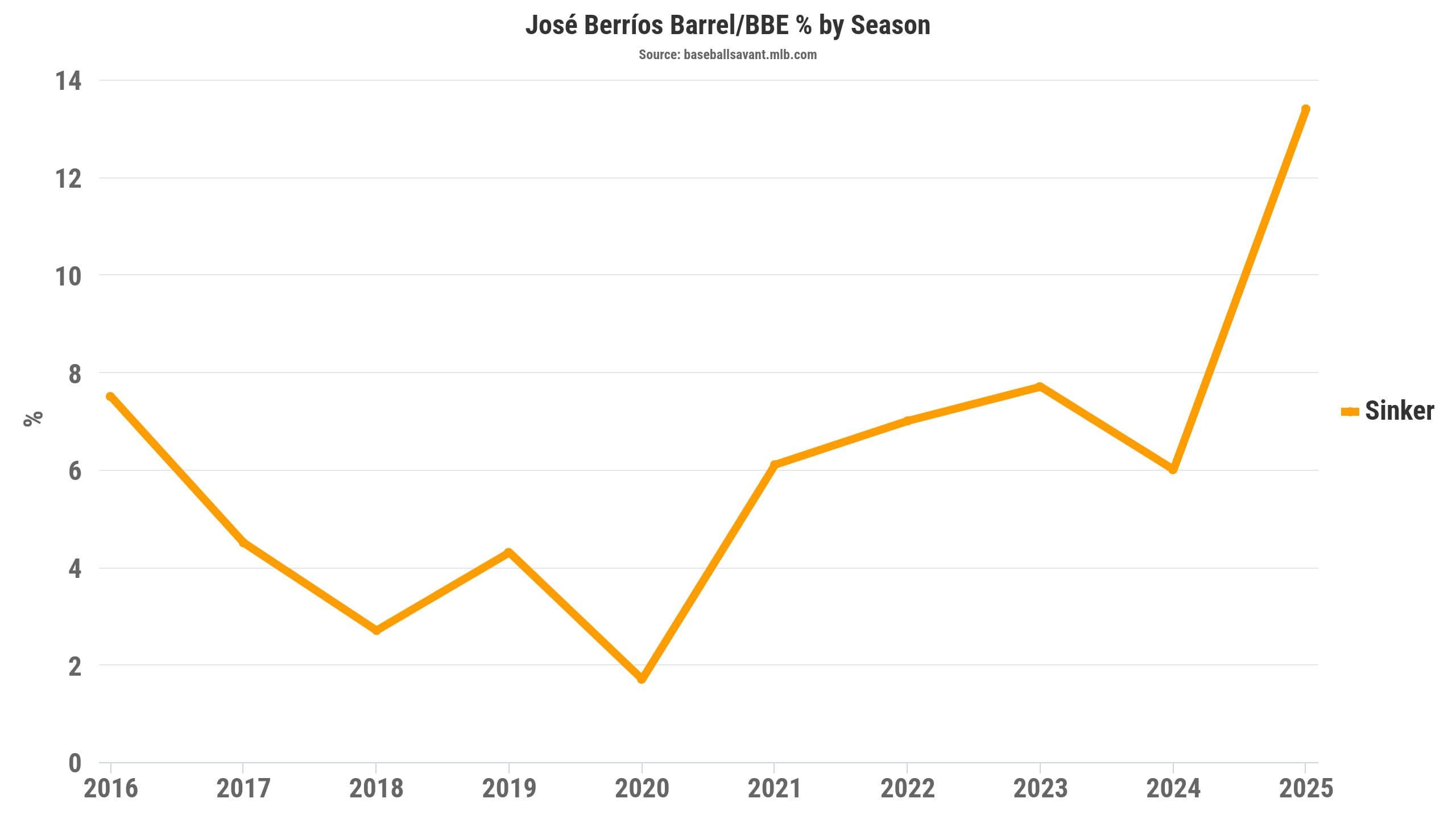 Part of that will include missing barrels more consistently, which primarily fuelled Berríos’ home run concerns — his 1.43 HR/9 ranks eighth-highest among big-league pitchers with at least 300 innings pitched since 2024 — last season, courtesy of his career-worst 11.3 per cent barrel rate against.