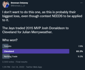 Obviously, except for 4.1 innings at the start of the 2021 season, Merryweather hasn’t had a great MLB career, but Donaldson’s trade value would’ve been higher if not for injuries.