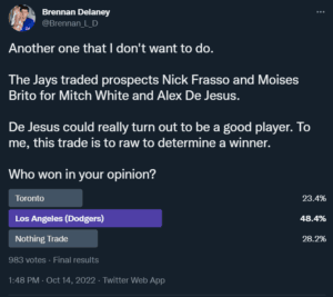 To me. This trade could either be good, or really bad. If Mitch White can do what Stripling did, and Alex De Jesus hits his ceiling, this would be a good trade, barring what Frasso does. If Frasso develops to his ceiling, and potentially better and White continues to struggle, yeah, this deal could go sideways pretty quickly.