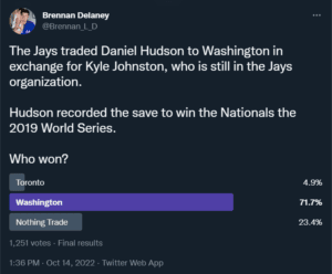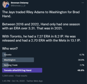 Because of that, neither the Jays nor the Nats won this trade, but the Jays did the second they DFA’ed Brad Hand. Now watch him close out game 7 of the World Series.