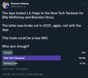 At the 2018 deadline, Happ’s contract was expiring, and it was evident that the Jays had no shot at contending, so they traded Happ to the Yankees for Brandon Drury and Billy McKinney.