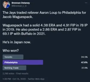 Even leading up to the trade, Loup struggled. He had a 4.54 ERA and 3.61 FIP in 35.2 innings pitched with the Jays before the trade, meaning he spent four seasons being a not-so-great reliever. Even with the Phillies, he posted a 4.50 ERA and 3.66 FIP in 4 innings pitched (appeared in nine games, this was before the three-batter minimum).