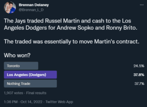 Before the start of the 2019 season, the Jays traded Canadian Russell Martin to the Dodgers in exchange for Andrew Sopko and Ronny Brito. In terms of value, yeah, those two prospects never amounted to much, and Martin was an MLB catcher. However, here’s why it’s a win in my opinion.