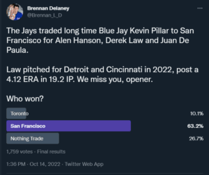 Probably the most “meh” trade in the article, the Jays sent Kevin Pillar to the San Francisco Giants in exchange for Alen Hanson, Derek Law, and Juan De Paula.