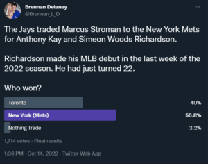 Both Kay and Simeon Woods Richardson have made their MLB debut. Kay, who is 27, has a career 5.48 ERA and 4.67 FIP in 70.2 innings pitched. Although he could still be something, I don’t think he ever matches Stroman’s production as a Jay.