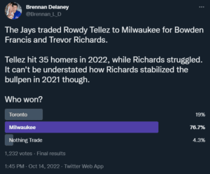 I’ve seen a lot of people think this trade was bad for the Jays, but I disagree with that as well. The Jays traded Rowdy Tellez to the Brewers for Trevor Richards and Bowden Francis.