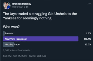 Like Loup, Drury, and even Hendriks, Urshela was a below-average player for the Jays. Even if you read replies to articles about the trade, it bordered between “who cares” and “the Yankees dumpster dive as well?!”. Hell, even Yankee fans didn’t care much for the trade.