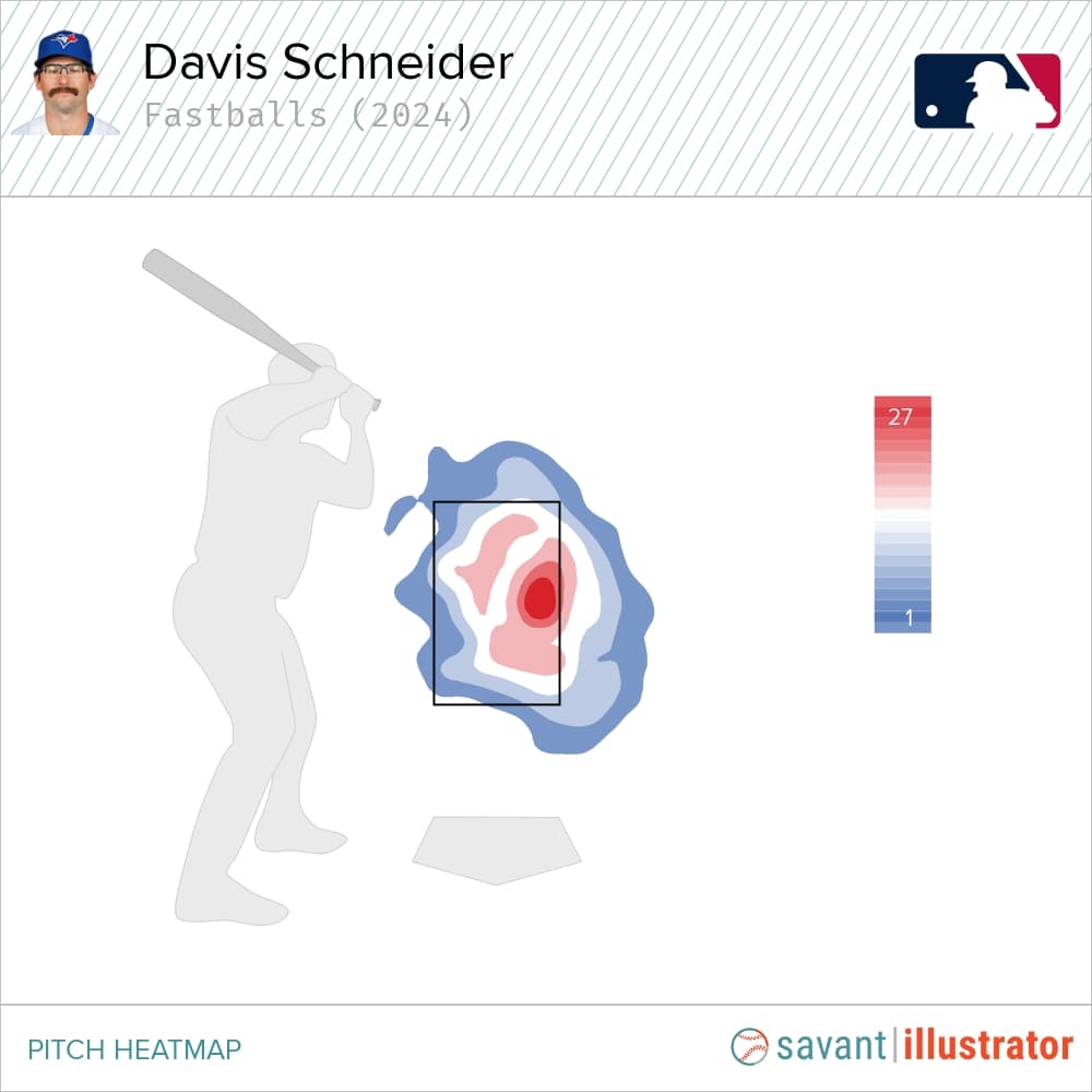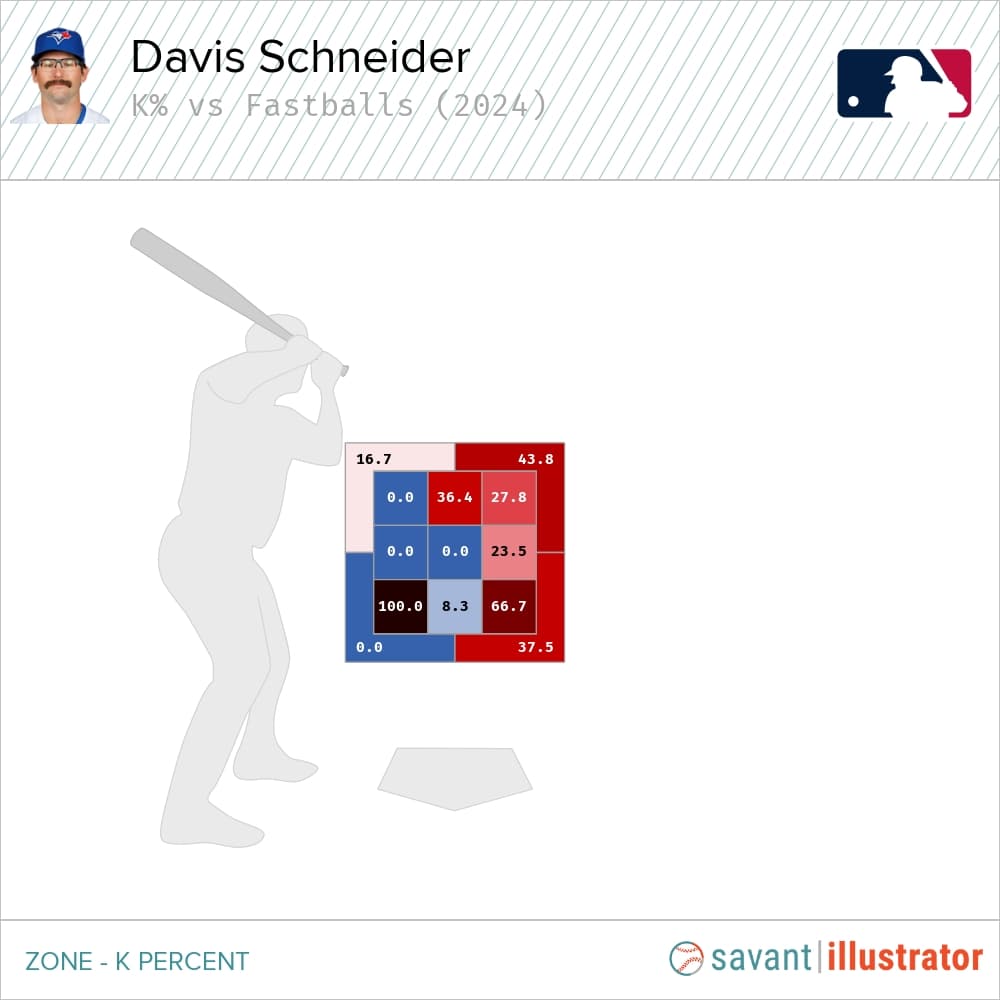 Everybody and their neighbour are aware of Schneider’s weakness versus high heaters. So, naturally, opposing hurlers have started throwing him more this month, especially since he owns a .234 AVG and .411 SLG against those offerings in 2024 — including a -3 run value versus four-seamers, the lowest figure of any pitch he’s faced.