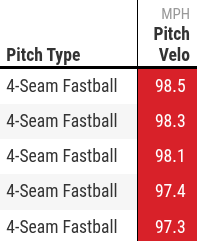 His first time out, however, the hard-throwing righty’s average fastball velocity dropped from 98.1 to 96.6 m.p.h. during his second inning of work. But on Tuesday against the Atlanta Braves, he held his velo the best he has all spring, averaging an identical 97.9 across the first two innings and 97.7 in the third — hitting 97.5 with his final four-seamer as part of a 54-pitch outing.
