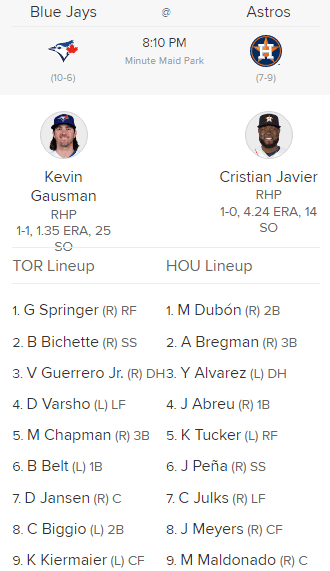 HOU: Christian Javier RHP — 1-0, 4.24 ERA, 1.176 WHIP, 7.4 K9, 0.1 bWAR.