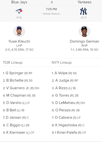 TOR: Yusei Kikuchi LHP — 2-0, 4.70 ERA, 1.239 WHIP, 10.0 K9, 0.0 bWAR.