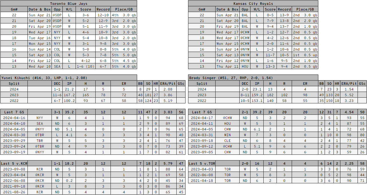 Now, they’ll square up with a Royals team off to a great start to the season, going 13-9 off the back of above average offence and pitching. Their pitching staff, led by the likes of Seth Lugo and Brady Singer, the latter of whom the Jays see tonight, have been rock solid to start the season and are getting great contributions from their bullpen, save for Will Smith’s shaky 12.38 ERA.