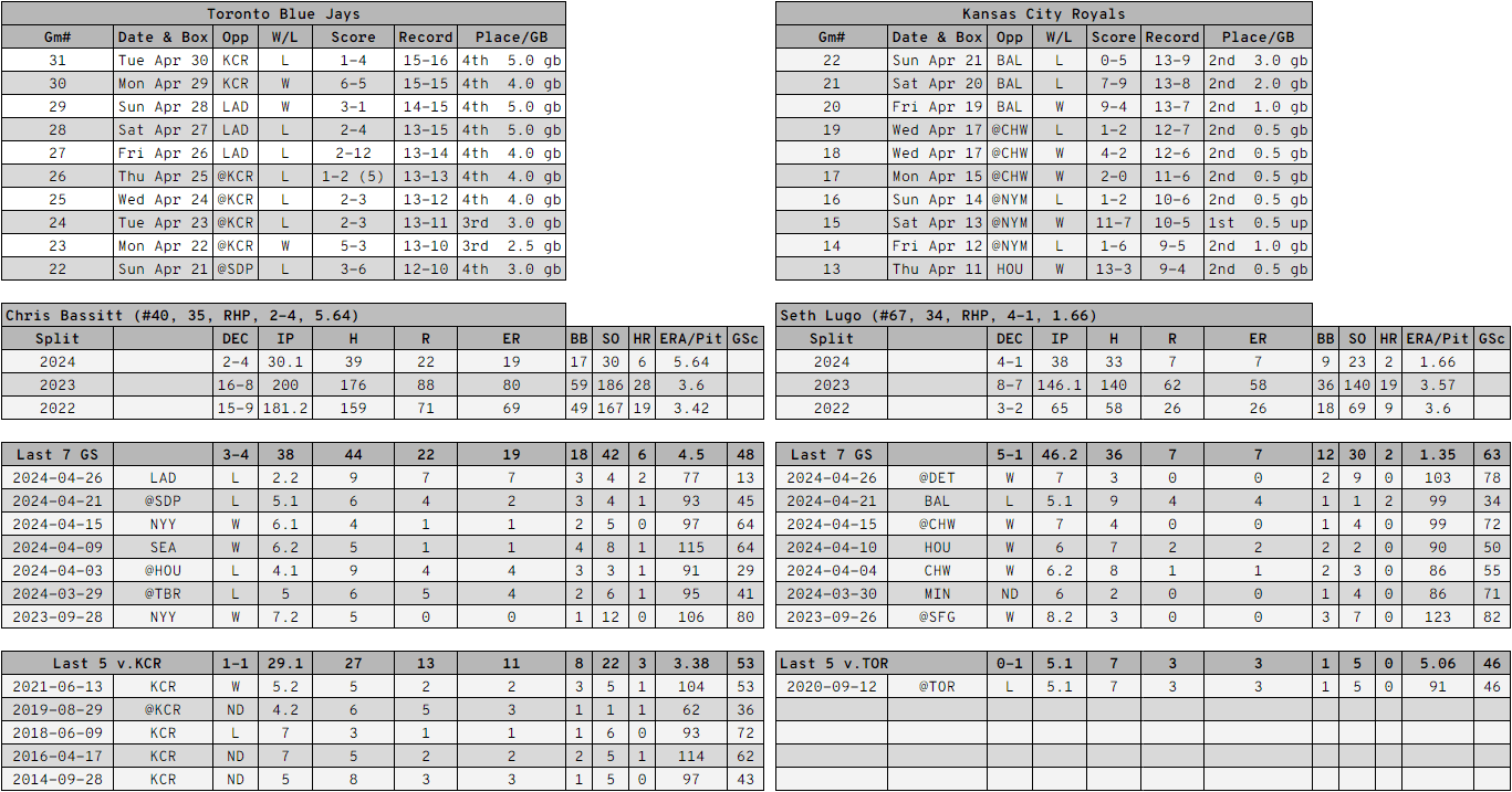 The Jays went 1-for-3 with runners in scoring position, but with Ragans issuing three walks and four hits, they weren’t able to take much advantage of them. It doesn’t get much easier for them today, as Seth Lugo takes the mound for the Royals. He’s had a great start to his season, allowing a 1.66 ERA and getting most of the outs without striking out opposing hitters.