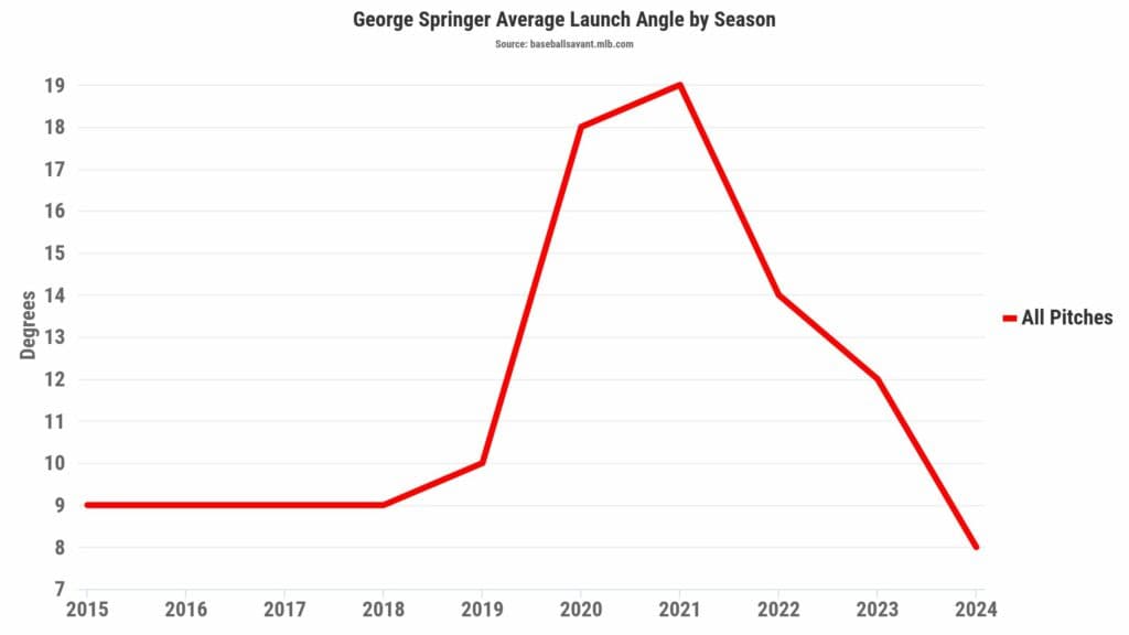 Springer’s average launch angle also peaked at 19 degrees in 2021 with the Blue Jays, which trickled down to 14 degrees in 2022, to 12 degrees in 2023, and to 8 degrees in 2024.